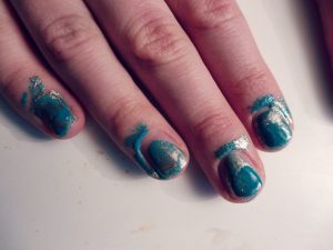 Omdat ik geen zin heb om mezelf en de tafel van nog meer glitters te voorzien, kies ik ervoor om de lak te druppelen op de nagels en die lichtjes uit te vegen met het speldje en mijn vingers. Een beetje een knoeiboel is het wel. Zodoende is het verstandig om nagellakremover bij de hand te hebben en je werkplek te bedekken met een krant of iets dergelijks.